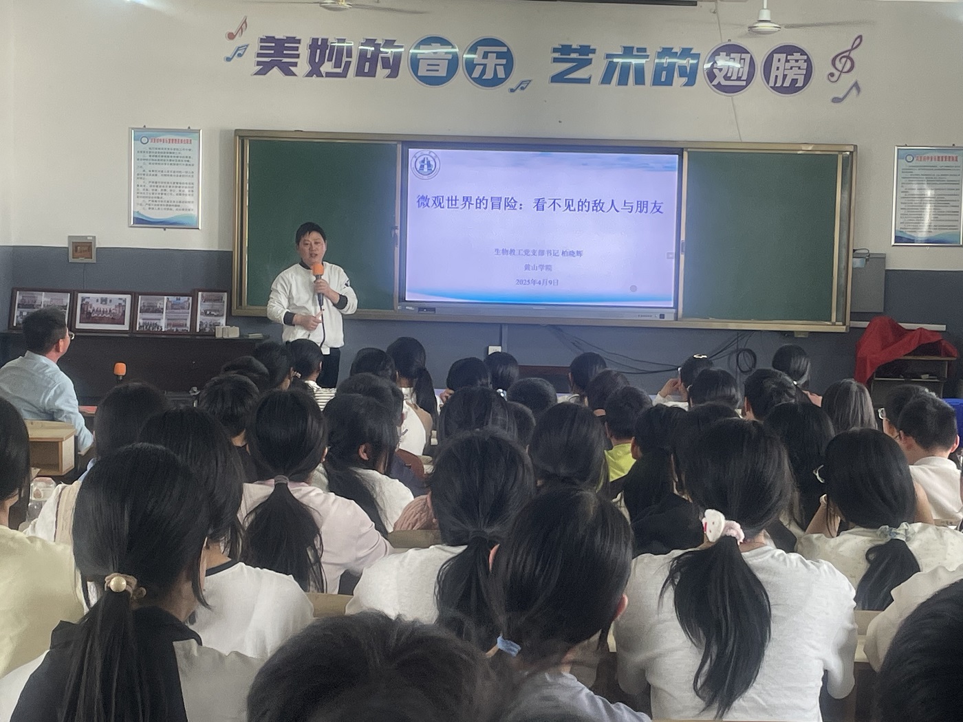 2025年4月9日,太阳成集团122ccvip生物教工党支部书记柏晓辉、组织委员兼宣传委员吕彩云、党员教师杨典成一行3人应休宁县洪里初级中学邀请,前往该校开展科普进校园活动。洪里初级中学董事长张国正、教导处主任程淑媛等教师及该校七年级、八年级员工100余人参加了活动。
