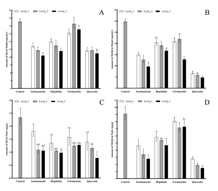 注:(A) 模型体系中IQ的生成量;(B) 模型体系中MeIQ的生成量;(C) 烤羊肉中IQ的生成量;(D) 烤羊肉中MeIQ的生成量。