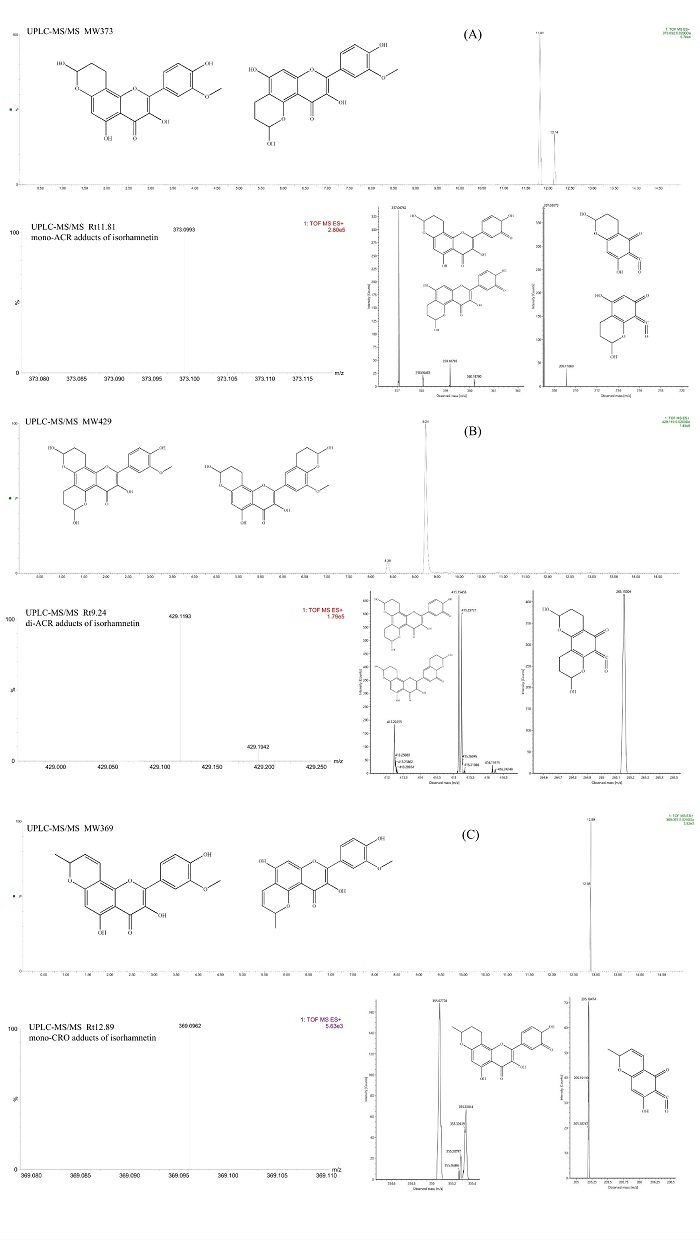 注:(A)单丙烯醛-异鼠李素加合物,(B)双丙烯醛-异鼠李素加合物,(C)丁烯醛-异鼠李素加合物。