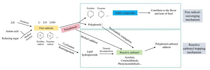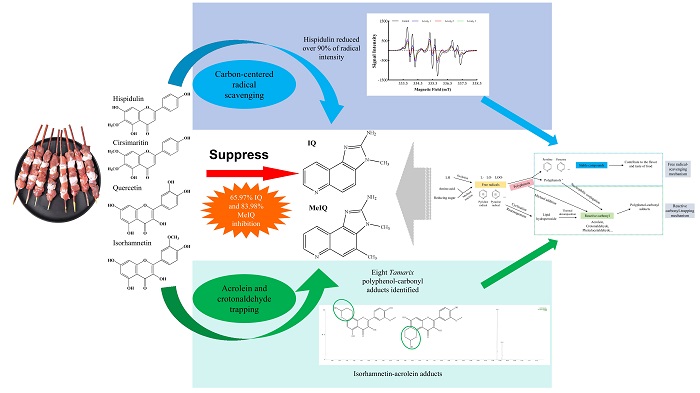 本研究首次提出了红柳多酚能够同时通过清除自由基和捕获活性羰基的共同作用机制进而抑制IQ和MeIQ形成的假设,为后续开展多酚抑制热加工肉制品中杂环胺的形成提供了新思路。