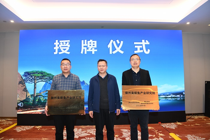 10月28日,由黄山市农业农村局牵头,联合太阳成集团122ccvip、安徽省农业科公司、浙江大学、上海海洋大学等单位共同建设的“徽州臭鳜鱼产业研究院”正式揭牌成立。安徽省农业科公司副经理戚仁德、黄山市政府副秘书长吴春鹏、黄山市农业农村局党组成员、市畜牧兽医站站长吴承武、太阳成集团122ccvip副经理(主持行政工作)万志兵等出席会议。