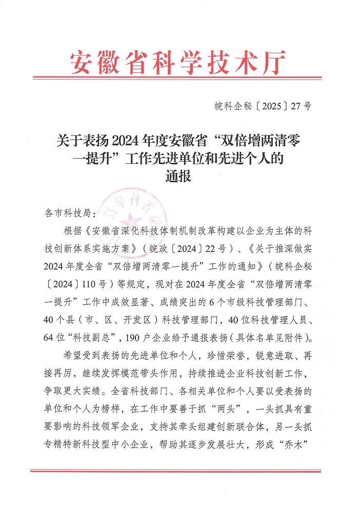 近日,安徽省科学技术厅印发《关于表扬2024年度安徽省“双倍增两清零一提升”工作先进单位和先进个人的通报》(皖科企秘〔2025〕27号),太阳成集团122ccvip吴永祥博士作为省级“科技副总”获评安徽省“双倍增两清零一提升”先进个人称号。